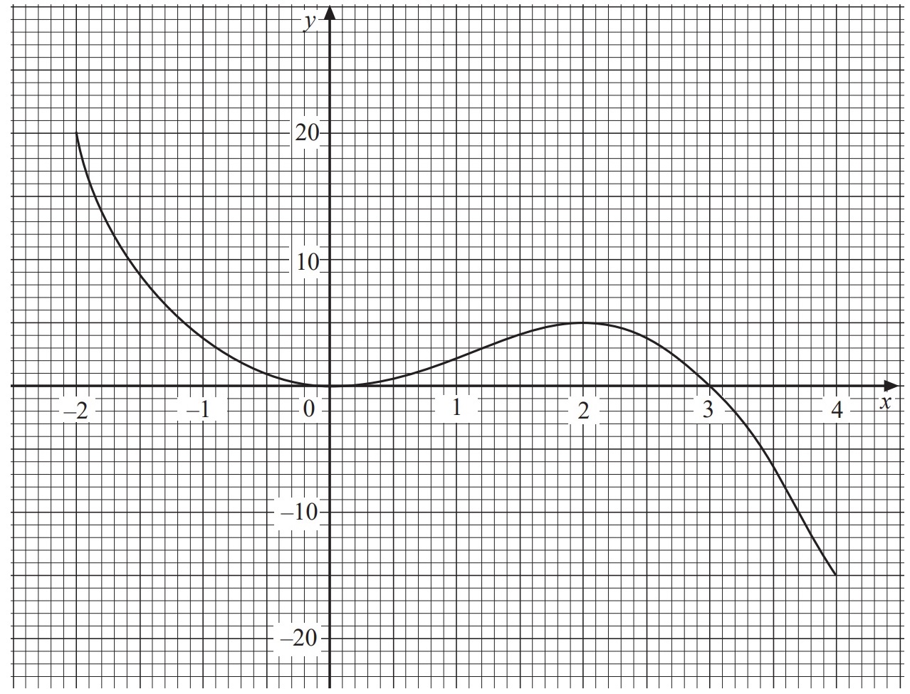 The diagram shows the graph of `y = 3x2 − x3` for `-2 < x < 4`.