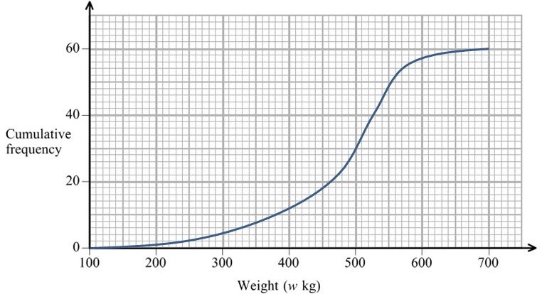 The cumulative frequency curve gives information on the weights of `60` cows.
