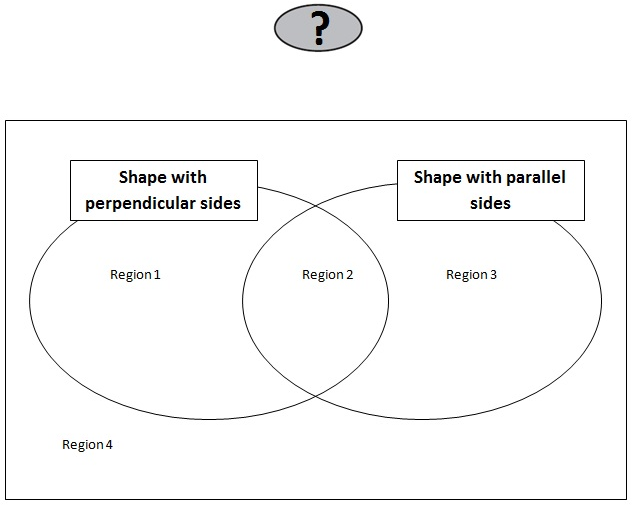The Venn diagram is used for sorting shapes.Which region would the shape shown go in?Choose your answer:A3B4C1D2ENone of the regions