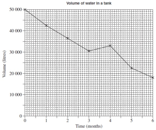 The graph below shows the volume of water in a storage tank over a 6 month period.