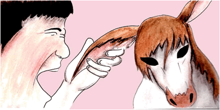 ‘It’s true, I was a donkey when you bought me, but, you see, before that I was a boy. I was rude to my mother, and my mother said, ‘If you are ever rude to me again may you be turned by the devil into a donkey.’ And so it was. But now that you have bought me, I am a boy once more and I belong to you.’
